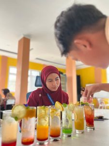 Dalam praktik ini, siswa diperkenalkan pada berbagai bahan, seperti sirup, jus buah segar, soda, serta garnish alami. Tidak sekadar meracik minuman, siswa juga dibimbing untuk memahami pentingnya kebersihan area kerja, ketepatan takaran, serta etika penyajian sebagaimana standar di industri perhotelan dan restoran. Suasana kelas praktik tampak hidup, dengan siswa yang aktif berdiskusi dan berani mengeksplorasi ide-ide baru.
